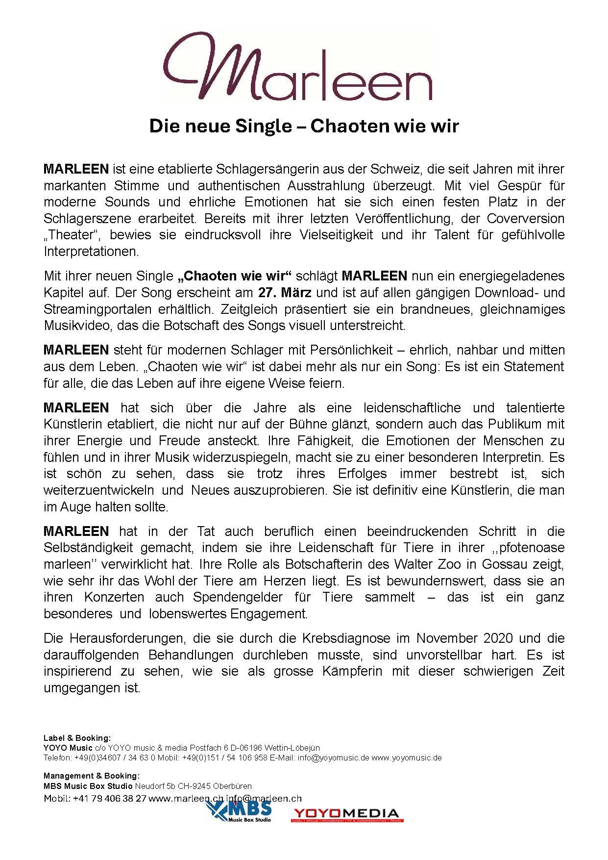 Die brandneue Single von MARLEEN "Chaoten wie wir"